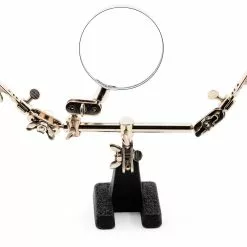 Has two spring-loaded alligator clips mounted on ball joints to hold parts at any angle, leaving hands free to work on your project. Features include wing nuts on a ball joints for ease of positioning and weighted base to give stability, and a 2X glass magnifier to assist in working on intricate projects.