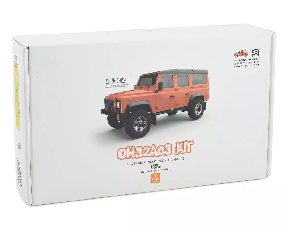 The Orlandoo OH32A03 1/32 Micro Crawler Kit is an incredibly capable micro size scaler. This cellphone sized kit includes a highly detailed Defender 110 hard plastic body, super soft scale tires, scale axles and five spoke mag wheels. But don’t let the micro size fool you! This little crawler is equipped with four-link suspension, friction shocks on all four corners and enough axle articulation to make this tiny truck a true performer. This kit shares many parts with the the 35A01 Jeep Wrangler, but compared to the Jeep this kit offers up 10mm longer wheelbase for increased stability.