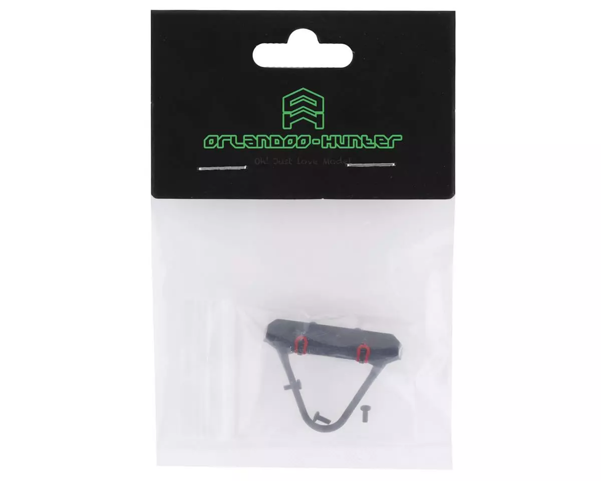 Orlandoo Hunter OH35A01 Metal Stinger Front Bumper with D-Rings. This optional bumper is a great scale accessory that not only looks good but can also help with crawling up obstacles. Package includes one black front bumper with D-rings.