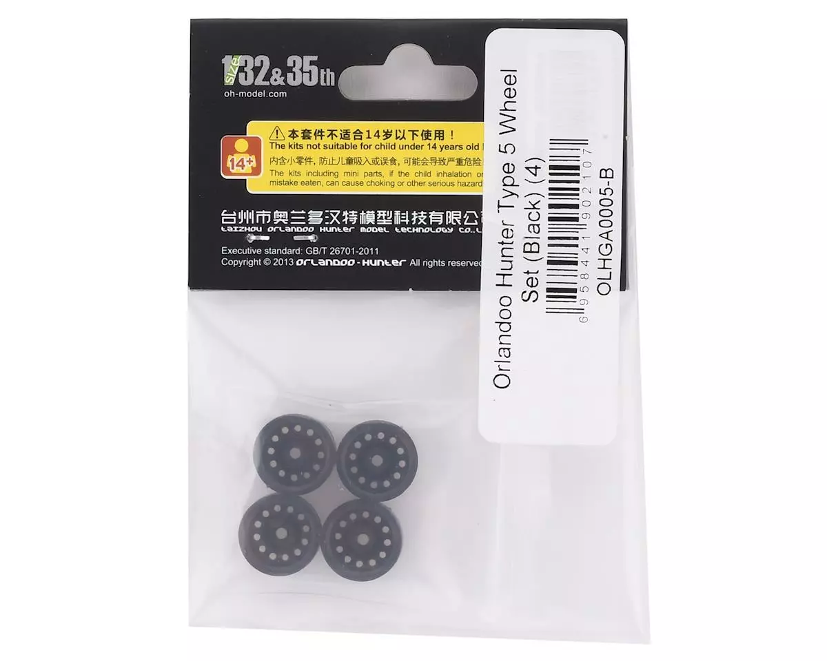 Orlandoo Hunter Type 5 Wheel Set. These optional wheels features a classic twelve hole design, and gives you a custom wheel choice that fits the size and scale of your Orlandoo 35A01 Jeep or 35P01 F150 kit perfectly. Package includes 4 wheels.